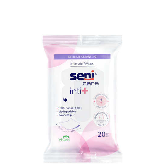 Die Seni Care inti+ Feuchttücher zur täglichen Intimpflege sind gynäkologisch getestet und hypoallergen. Dank ihrer handlichen Maße – 12 x 19 cm – eignen sie sich auch perfekt für unterwegs. Die Tücher sind zudem schonend zur Umwelt, da sie im Wasser auflösbar und somit vollständig biologisch abbaubar sind. Die inti+ Feuchttücher neutralisieren unangenehme Gerüche.