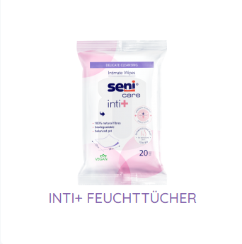 Die Seni Care inti+ Feuchttücher sind gynäkologisch getestet und eignen sich zur täglichen Intimpflege – auch perfekt für unterwegs.