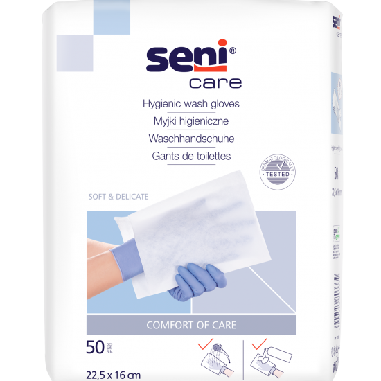 Die Seni Care Waschhandschuhe sind ideal zum Auftragen von Pflegeprodukten, die mit Wasser verwendet werden, beispielsweise der Seni Care Waschcreme 3 in 1.
