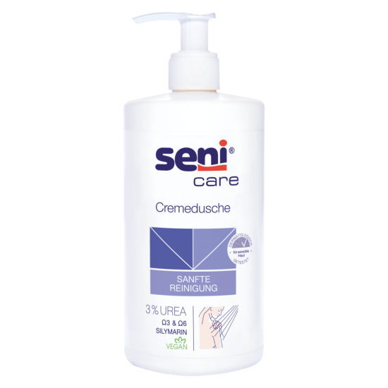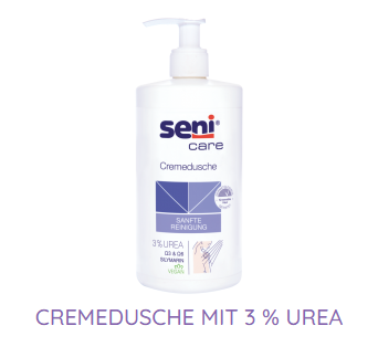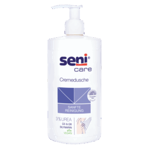 Die Seni Care Cremedusche mit 3 % Urea pflegt die trockene Haut sanft und spendet Feuchtigkeit.