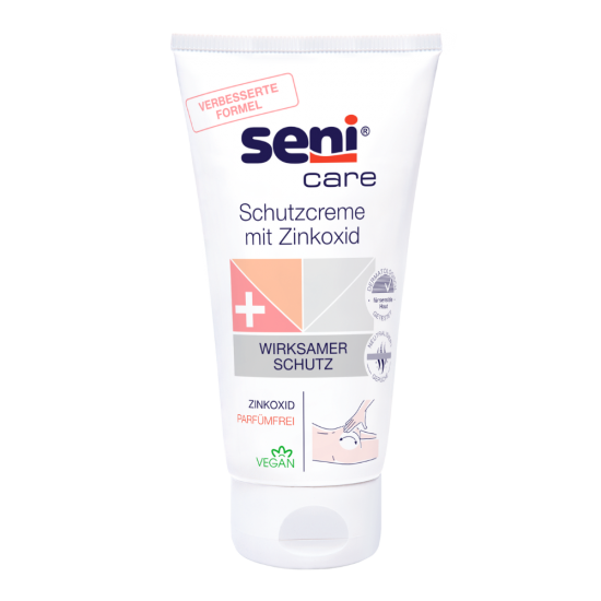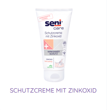 Die Seni Care Schutzcreme mit Zinkoxid pflegt die Haut und spendet Feuchtigkeit. Ihre Regeneration wird bei Reizung beschleunigt.